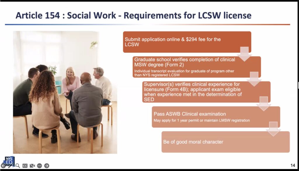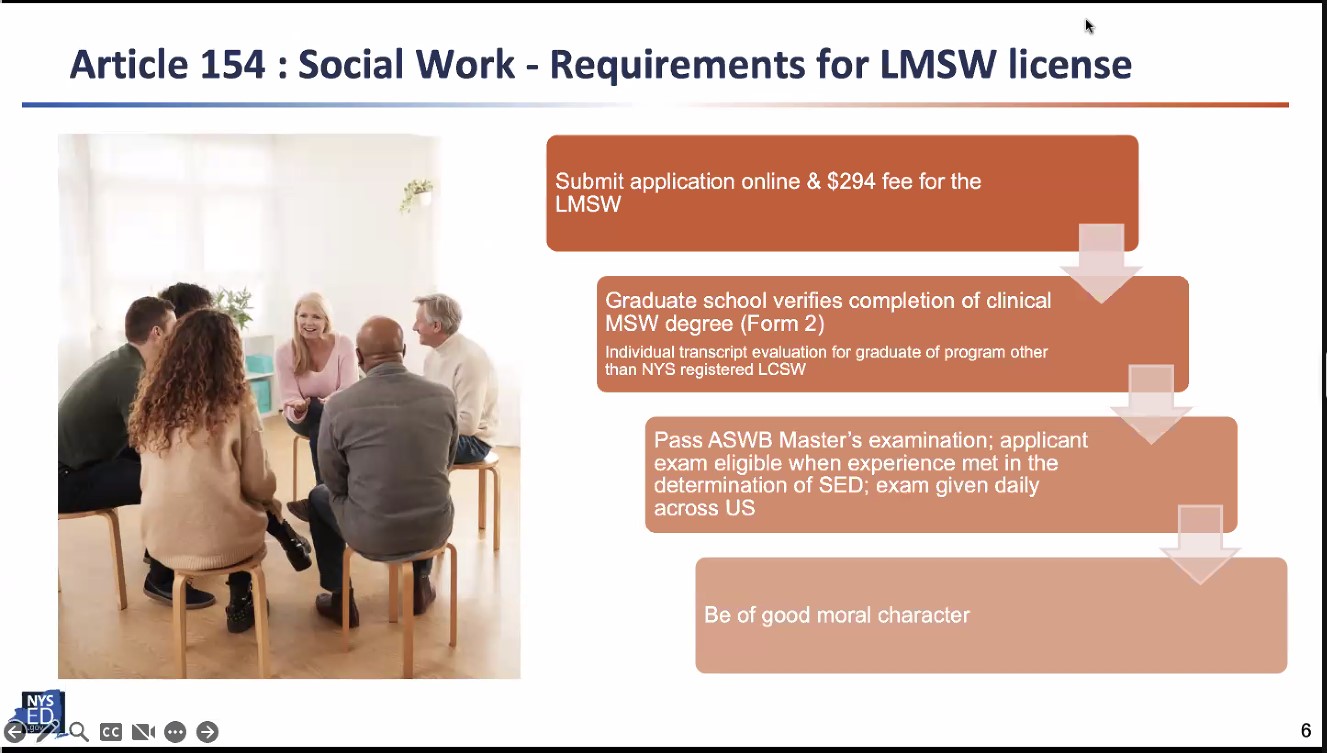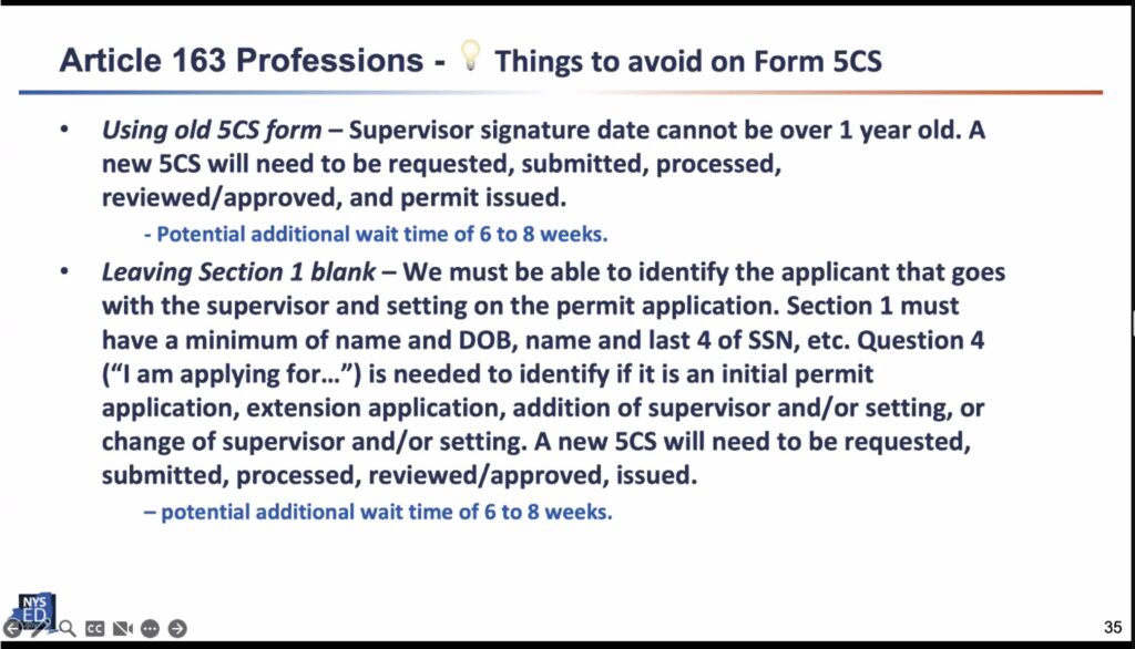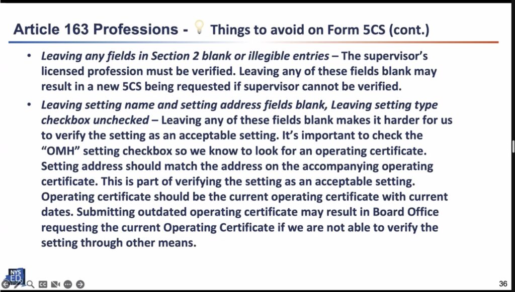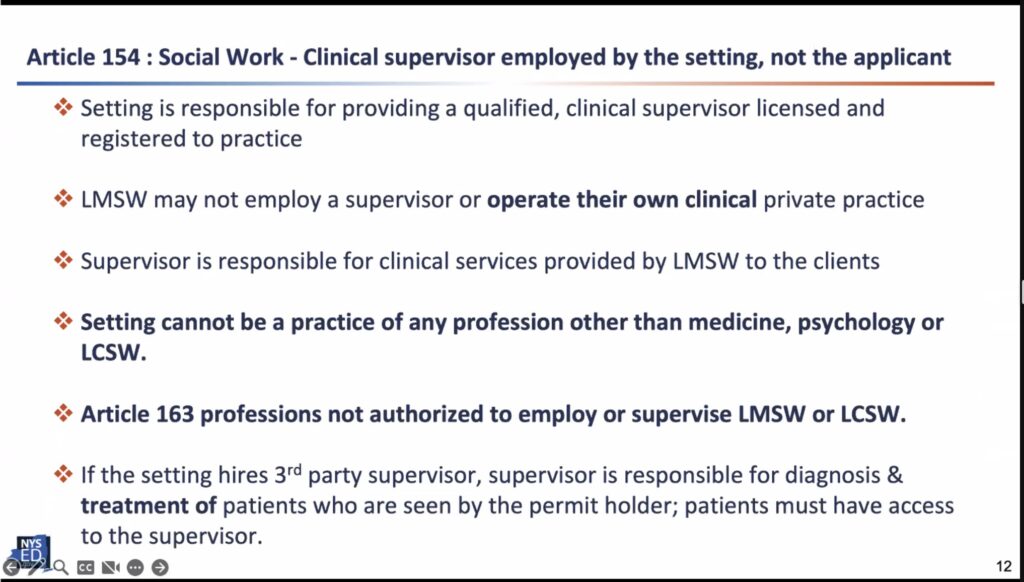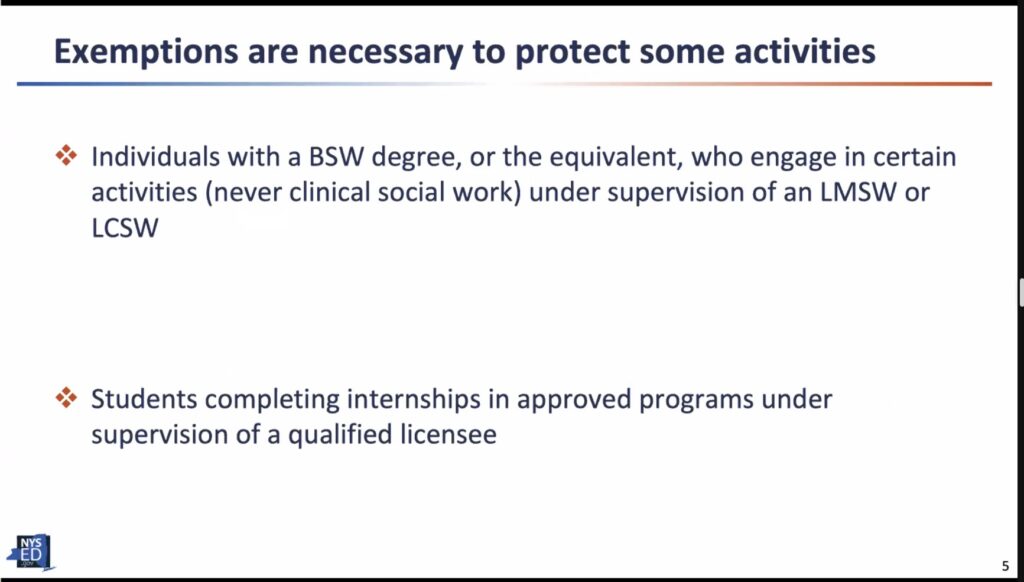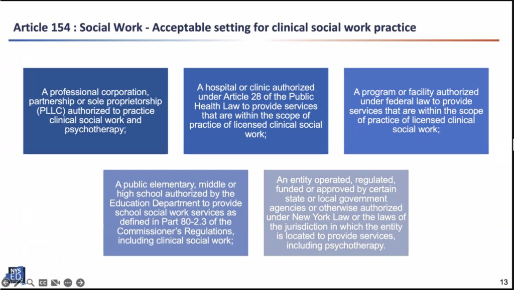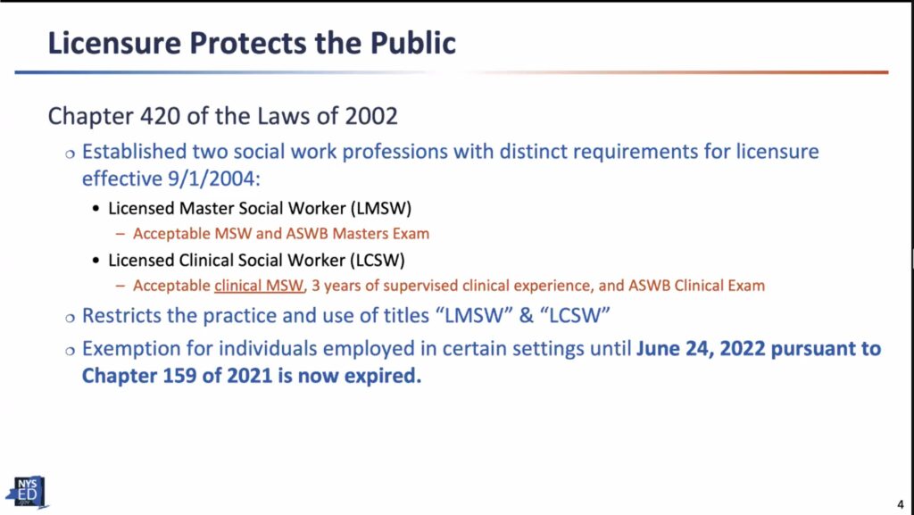 I attended the SED Scope of Practice webinar today. I want you to know that I weighed in repeatedly with OMH leads regarding our disappointment that the Webinar was (in my opinion) quite different from what was advertised and (more importantly) not what the majority of us needed. I also made it clear to all of the speakers that while we understand the mandate at SED is to ‘protect the public’ the Department should consider whether delaying access to care as the result of the numerous hoops and potholes that need to be cleared by our staff along the way to full employment along with the significant scope of practice limitations now in place is antithetical to the reality of protecting the public. In my mind, protecting the public requires regulators to be flexible, to understand what’s happening on the ground, and to find ways to modernize these processes with the goal of opening up access to services and protecting continuity of care. Just my two cents.