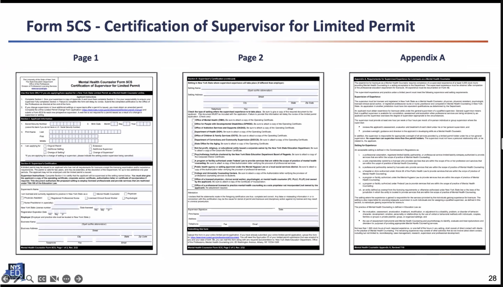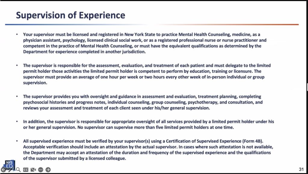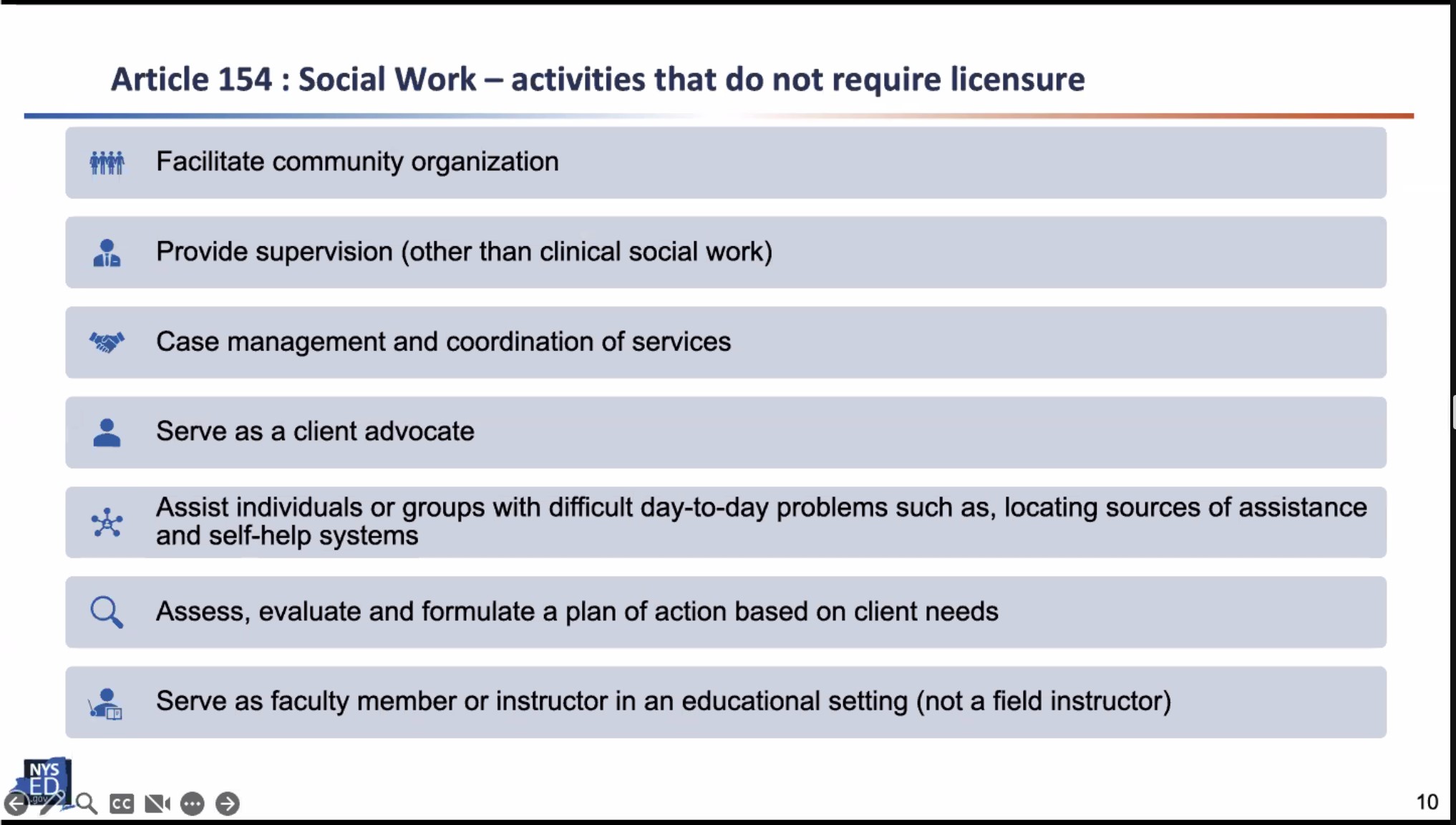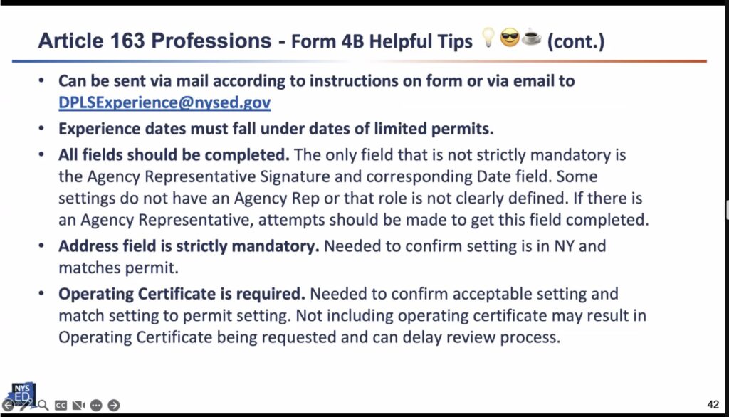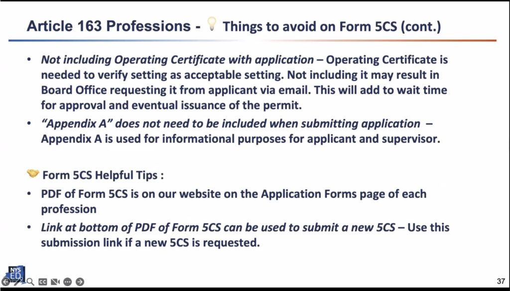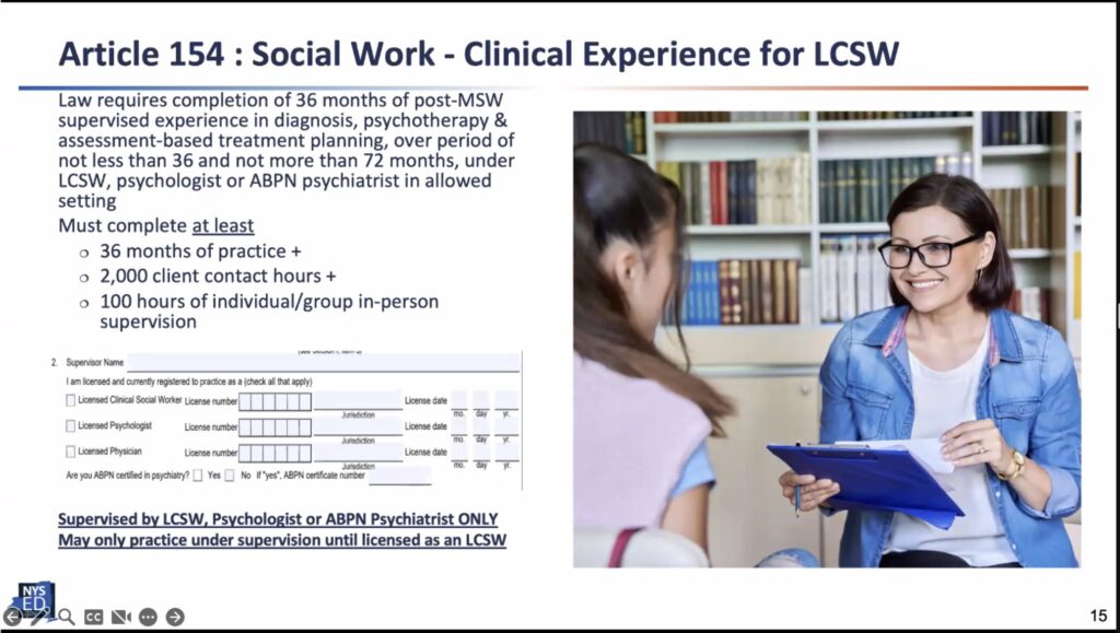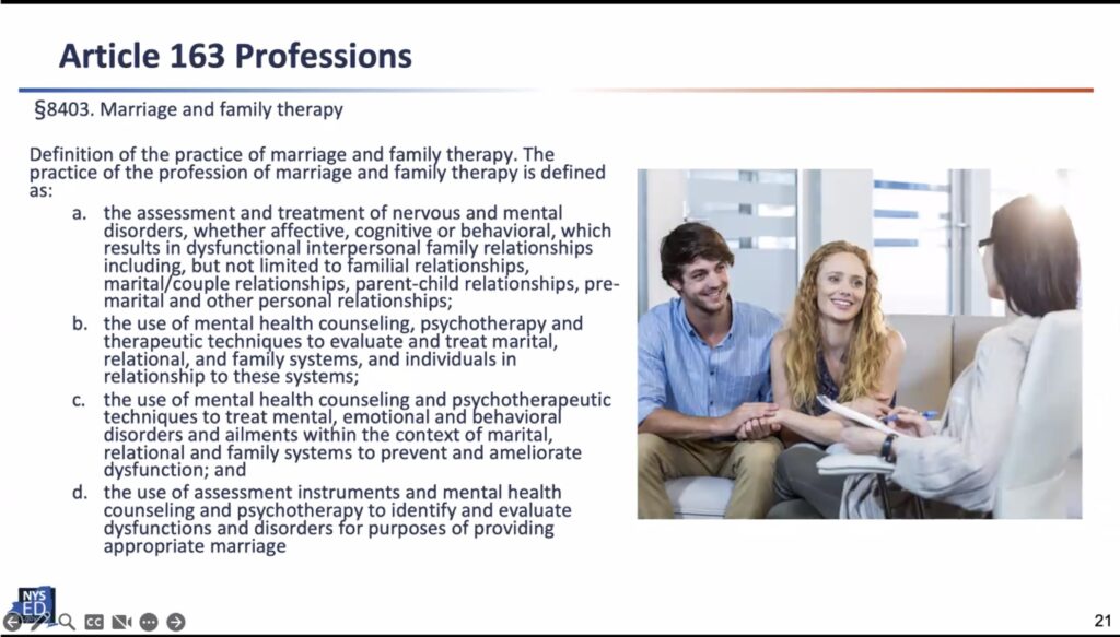 I attended the SED Scope of Practice webinar today. I want you to know that I weighed in repeatedly with OMH leads regarding our disappointment that the Webinar was (in my opinion) quite different from what was advertised and (more importantly) not what the majority of us needed. I also made it clear to all of the speakers that while we understand the mandate at SED is to ‘protect the public’ the Department should consider whether delaying access to care as the result of the numerous hoops and potholes that need to be cleared by our staff along the way to full employment along with the significant scope of practice limitations now in place is antithetical to the reality of protecting the public. In my mind, protecting the public requires regulators to be flexible, to understand what’s happening on the ground, and to find ways to modernize these processes with the goal of opening up access to services and protecting continuity of care. Just my two cents.