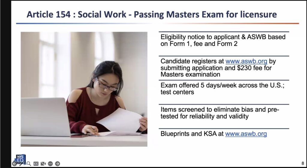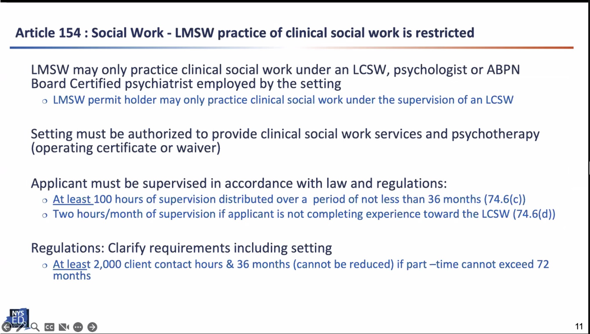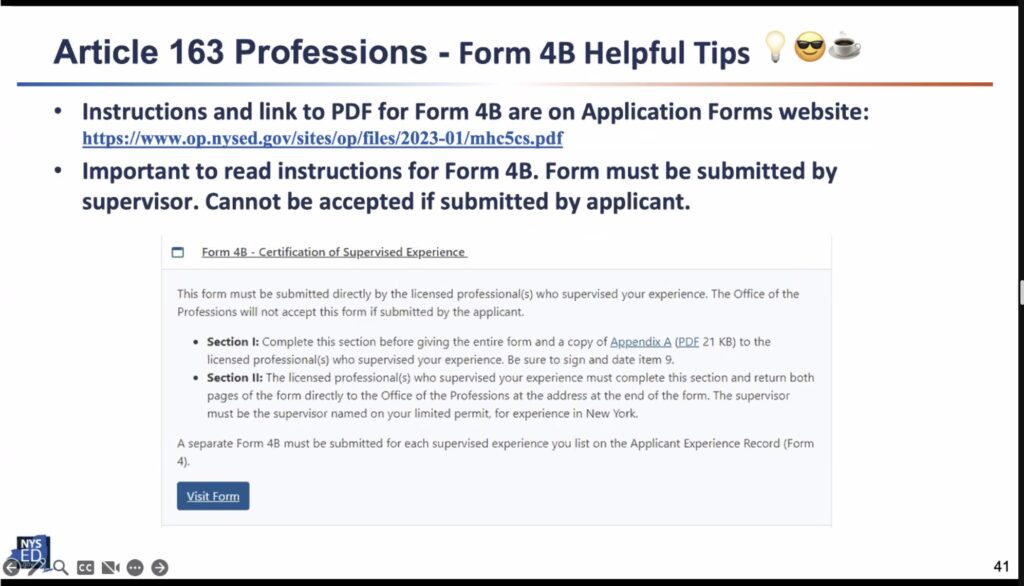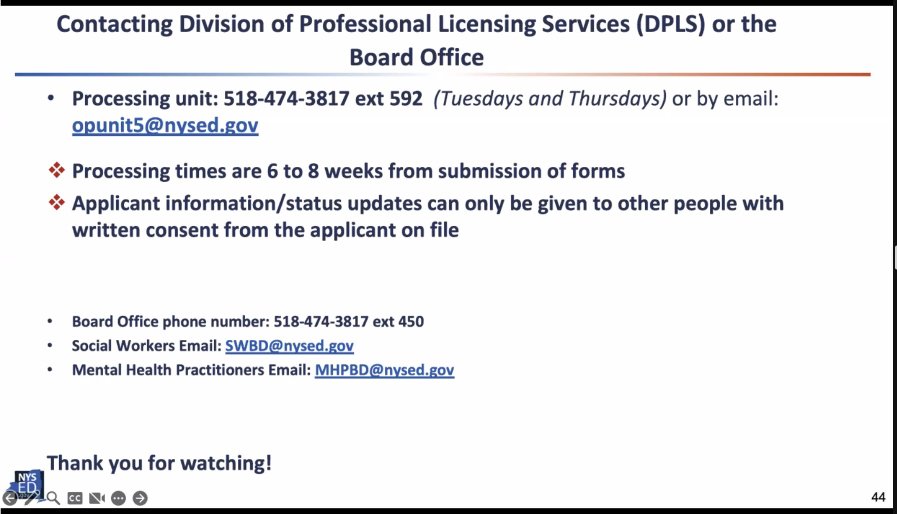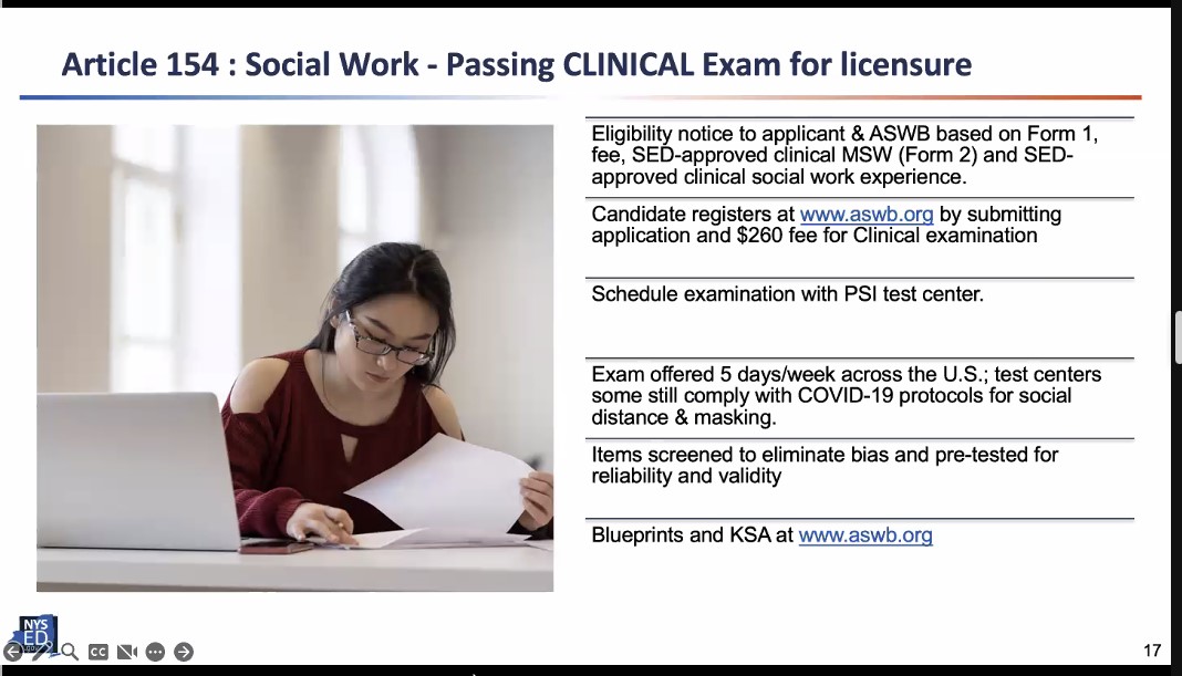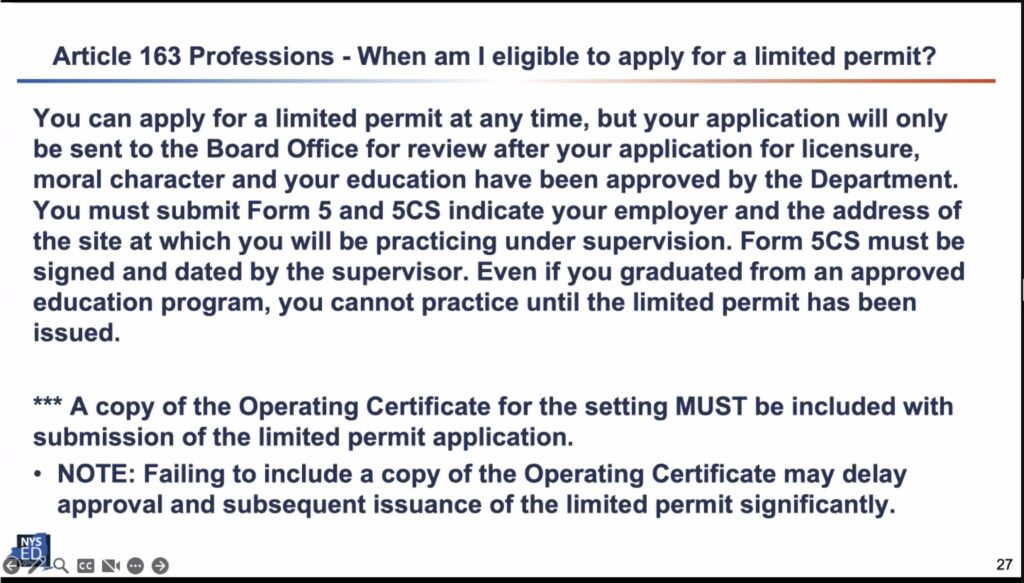 I attended the SED Scope of Practice webinar today. I want you to know that I weighed in repeatedly with OMH leads regarding our disappointment that the Webinar was (in my opinion) quite different from what was advertised and (more importantly) not what the majority of us needed. I also made it clear to all of the speakers that while we understand the mandate at SED is to ‘protect the public’ the Department should consider whether delaying access to care as the result of the numerous hoops and potholes that need to be cleared by our staff along the way to full employment along with the significant scope of practice limitations now in place is antithetical to the reality of protecting the public. In my mind, protecting the public requires regulators to be flexible, to understand what’s happening on the ground, and to find ways to modernize these processes with the goal of opening up access to services and protecting continuity of care. Just my two cents.